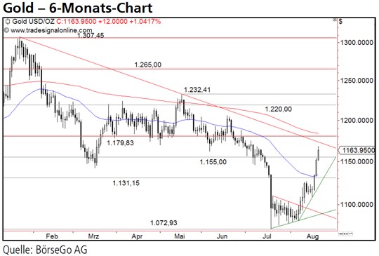Bis Mitte Juli befand sich der Goldpreis in einer steilen Abwärtsbewegung, die das Edelmetall bis auf 1.072,93 USD einbrechen liess, ehe es zu einer dreiecksförmigen Stabilisierungsphase kam.