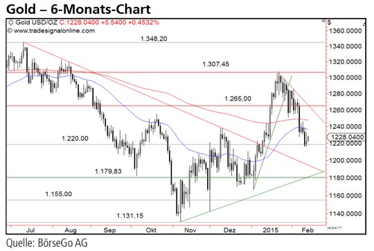 Jetzt informierenAusblick: Der Goldpreis ist im Rahmen seiner kurzfristigen Abwärtsbewegung an einem entscheidenden Punkt angekommen. Ein Bruch der 1.220,00 USD-Marke könnte den Aufwärtstrend der Vormonate beenden. Die Short-Szenarien: Bricht der Wert jetzt deutlich unter die Unterstützung bei 1.220,00 USD ein, wäre ein kurzfristiges Verkaufssignal aktiv und mit einem Rückfall auf die Haltemarke bei 1.179,83 USD zu rechnen. Auf diesem Niveau verlaufen zudem die kurzfristige Aufwärtstrendlinie und die überschrittene mittelfristige Abwärtstrendlinie. Dieser charttechnische Knotenpunkt sollte von den Bullen entsprechend für eine Erholung genutzt werden. Setzt Gold dagegen auch unter diese Unterstützungszone zurück, käme es zu einem direkten Einbruch bis 1.131,15 USD. Die Long-Szenarien: Sollte sich der Goldpreis dagegen auf dem aktuellen Niveau stabilisieren können, wäre ein leichter Anstieg bis 1.250,00 und 1.265,00 USD zu erwarten. Allerdings würde erst ein Ausbruch über diesen starken Widerstand ein bullishes Signal liefern. In diesem Fall könnte eine Kaufwelle bis 1.307,45 USD führen. Aufgrund der aktuellen Schwäche des Wertes ist jedoch mit einem Abprallen an der 1.265,00 USD-Marke und einer Fortsetzung der Korrektur zu rechnen.