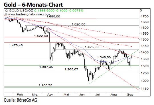Noch ist die kurzfristige Korrekturphase bei Gold nicht überwunden. Ein Ausbruch über den Kreuzwiderstand bei 1.380,00 USD wäre jedoch ein starkes Indiz für eine Fortsetzung der Erholung. Die Long-Szenarien: Sollte es den Bullen entsprechend gelingen, die Hürde bei 1.380,00 USD zu durch- brechen, wäre ein kleines Kaufsignal generiert und mit einem Anstieg bis an die Barriere bei 1.425,00 USD zu rechnen. An dieser Stelle könnte es zu weiteren Verlusten kommen. Würde die Marke jedoch gebrochen, wäre ein mittelfristiges Kaufsignal aktiv. Kurzfristig dürfte diesem Ausbruch ein Anstieg bis 1.476,45 USD folgen. Auf mittlere Sicht sollte das Edelmetall je- doch bis 1.522,40 USD haussieren. Die Short-Szenarien: In der aktuellen Situation wäre erst ein nachhaltiger Bruch der Halte- marke bei 1.307,45 USD problematisch. In diesem Fall dürfte sich die Korrektur seit Ende August bis zur wichtigen Unterstützung bei 1.265,07 USD ausdehnen. An dieser Stelle müssten die Bullen wieder in das Geschehen eingreifen, da ein Bruch der Marke zu einem Ausverkauf bis 1.179,83 USD führen könnte.