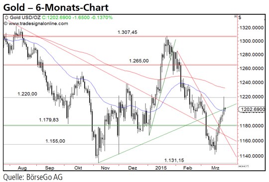 Rückblick: Von Ende November 2014 bis zum Februar dieses Jahres stieg der Goldpreis in einer Erholung an den Widerstand bei 1.307,45 USD, scheiterte jedoch an dieser Marke und brach anschliessend unter die Unterstützung bei 1.179,83 USD ein.