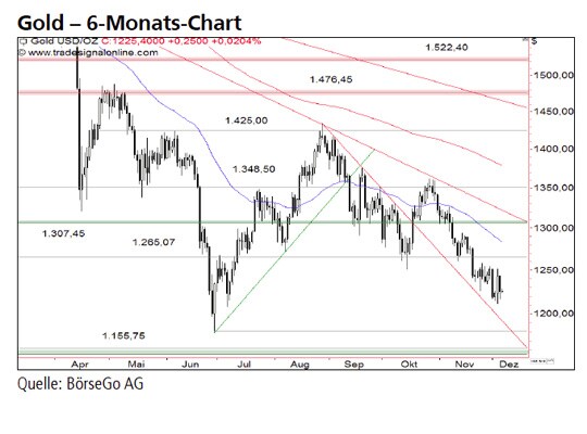 Jetzt informierenAusblick: Trotz des kurzfristigen Anstiegs am vergangenen Mittwoch befindet sich der Goldpreis weiter in einer Abwärtsspirale. Die Vorteile liegen weiterhin auf Seiten der Bären. Die Short- Szenarien: Nach einer leichten Erholung, die durchaus bis an die Hürde bei 1.265,07 USD führen kann, dürften die Bären nach unserer Auffassung den Druck wieder erhöhen. Dort wäre entsprechend mit einer weiteren Abwärtsbewegung bis 1.220,00 USD zu rechnen. Sollte diese Marke im weiteren Verlauf ebenfalls durchbrochen werden, könnte nur mehr die Unterstützung bei 1.179,00 USD einen erneuten massiven Kurseinbruch aufhalten. Denn sollte auf diesem Niveau eine Stabilisierung ausbleiben, sind weitere Verluste bis 1.155,75 und 1.100,00 USD wahrscheinlich. Die Long-Szenarien: Kann Gold hingegen über 1.265,07 USD ausbrechen, könnte sich die laufende kurzfristige Erholung bis 1.307,45 USD ausdehnen. Auf diesem Niveau verläuft aktuell auch die langfristige Abwärtstrendlinie, die wiederum für Verkaufsdruck sorgen könnte. Wird dieser Kreuzwiderstand dagegen im weiteren Verlauf gebrochen, würde ein Kaufsignal mit einem Ziel bei 1.425,00 USD aktiviert.