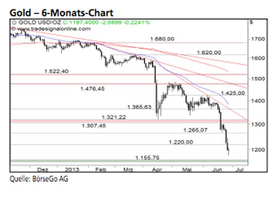 Jetzt informierenAusblick: Der Preisverfall bei Gold ist an Abwärtsdynamik kaum mehr zu überbieten. Dennoch könnte es ausgehend von 1.155,75 USD zu einer leichten Erholung kommen. Die ShortSzenarien: Kurzfristig könnte Gold an die Hürde bei 1.220,00 USD und darüber bis 1.265,07 USD ansteigen, doch bereits auf diesem Niveau dürften weitere Abgaben einsetzen. Bricht der Wert anschliessend auch unter die 1.155,75 USD-Marke ein, dürfte die Unterstützung bei 1.110,00 USD angesteuert werden. Unterhalb dieser Marke droht sogar ein Ausverkauf bis 1.070,00 USD. Die Long-Szenarien: Ein nachhaltiger Anstieg über 1.265,07 USD würde die Situation dagegen nur geringfügig entspannen. Zwar könnte in diesem Fall eine Erholung bis zur massiven Widerstandszone von 1.307,45 bis 1.321,22 USD einsetzen. Allerdings ist es derzeit fraglich, ob es den Bullen gelingt diese enorme Barriere zu durchbrechen. Vielmehr dürfte sich der Ausverkauf von dort aus fortsetzen.