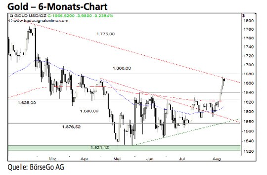 Ausblick: Auf Sicht der nächsten Tage dürfte der Seitwärtsmarkt von Gold beendet sein und sich eine weitere Auf- wärtsbewegung anschliessen. Der Bruch der mittelfristigen Abwärtstrendlinie ist jedoch nach unserer Auffassung eine zentrale Bedingung für die Fortsetzung der Aufwärtsbewe- gung. Die Long-Szenarien: Ausgehend vom aktuellen Niveau dürfte Gold zunächst an die Ausbruchsmarke bei 1.640,00 USD zurücksetzen, ehe sich von dort aus eine weitere Kauf- welle anschliessen dürfte. Wird in deren Verlauf die Wider- standszone von 1.675,00 bis 1.680,00 USD überwunden, kann sich der Aufwärtsimpuls bis 1.720,00 USD und darüber bis 1.750,00 USD fortsetzen. Selbst eine Ausdehnung der Auf- wärtsbewegung in den Bereich des Jahreshochs bei 1.790,66 USD wäre in diesem Fall möglich. Die Short-Szenarien: Soll- te die wichtige Unterstützung bei 1.640,00 USD dagegen gebrochen werden, dürfte eine stärkere Korrekturbewegung bis 1.625,00 und darunter bis 1.600,00 USD einsetzen. Der Ausbruch über den Widerstand wäre jedoch erst bei einem deutlichen Ausverkauf unter die Unterstützungsmarke bei 1.600,00 USD neutralisiert. In diesem Fall würde nicht nur der Seitwärtsmarkt der Vorwochen wiederaufgenommen. Viel- mehr könnte bereits ein Kursrutsch bis 1.521,12 USD drohen. Aus diesem Grund könnte man eingegangene Longpositionen nach unserer Auffassung mit einem Stoploss knapp unterhalb von 1.600,00 USD absichern.