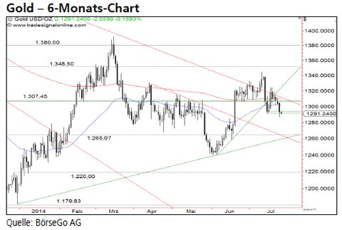Jetzt informierenAusblick: Nach dem starken Anstieg im Juni ist die laufende Korrektur nicht ungewöhnlich. Dennoch sollten die Käufer jetzt wieder aktiv werden, um den übergeordneten Aufwärtstrend nicht zu gefährden. Die Long-Szenarien: Kann sich Gold wieder über die Hürde bei 1.307,45 USD zurückarbeiten, wäre mit einer Fortsetzung der Aufwärtsbewegung bis 1.324,70 USD zu rechnen. Dort könnte es zu weiteren Abgaben kommen. Ein Ausbruch über die Hürde hätte dagegen ein Kaufsignal und eine Kaufwelle bis 1.348,50 USD zur Folge. Oberhalb dieser Barriere könnte das Edelmetall anschliessend bis 1.380,00 USD ansteigen. Die Short-Szenarien: Bricht der Goldpreis hingegen unter die Unterstützung bei 1.291,00 USD ein, hätte dies ein kurzfristiges Verkaufssignal zur Folge. Ein Ausverkauf bis 1.265,07 USD würde dann die Erholungsbemühungen der Käufer zunichtemachen und für eine Fortsetzung der Korrektur sorgen. Sollte diese Unterstützung nicht zu einer Bodenbildung genutzt werden, käme es zudem zum Bruch der mittelfristigen Aufwärtstrendlinie und damit zu Abgaben bis 1.220,00 USD.