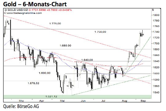 Der Aufwärtstrend des Goldpreises verläuft hochdynamisch und dürfte sich auf Sicht der kommenden Wochen fortsetzen. Kurzfristig könnte es nach unserer Auffassung jedoch zu einer leichten Zwischenkorrektur kommen. Die Long-Szenarien: Ausgehend von 1.750,00 USD dürfte eine Konsolidierungsphase einsetzen, die Gold zunächst bis 1.720,00 USD zurückführen könnte. Würde auch diese Marke unterschritten, sind weitere Verluste bis 1.680,00 USD möglich, ohne jedoch den Aufwärtstrend zu gefährden. Spätestens von dort aus sollte es zu einem weiteren Anstieg und einem Ausbruchsversuch über 1.750,00 USD kommen. Oberhalb dieser Marke könnte der Wert direkt bis 1.775,00 und 1.800,00 USD ansteigen. Selbst eine Ausdehnung der Rally bis 1.850,00 USD wäre denkbar. Die Short-Szenarien: Würde die Unterstützung bei 1.680,00 USD dagegen nicht zu einer Fortsetzung der Rally genutzt werden, dürfte ein Rücklauf bis 1.640,00 USD führen. Doch erst ein Ausverkauf unter diese Marke wäre bearish zu werten und würde Verluste bis 1.576,52 USD nach sich ziehen.