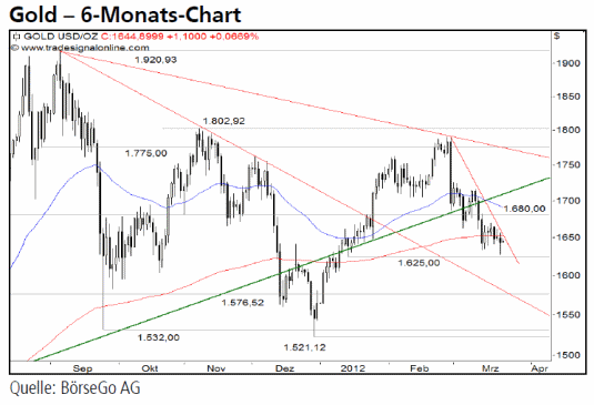 Ausblick: Noch besteht im Goldpreis eine Pattsituation mit leichten Vorteilen für die Käuferseite. Dennoch ist es nun für die Bullen aus unserer Sicht essentiell, die Marke bei 1.625,00 USD zu verteidigen. Die Long-Szenarien: Kann der Goldpreis oberhalb von 1.625,00 USD verbleiben und im Anschluss an die erfolgreiche Verteidigung dieser Marke über 1.680,00 USD ansteigen, wäre die Korrekturphase vorerst beendet. In diesem Fall dürfte sich der Wert wieder in Richtung 1.775,00 und 1.802,92 USD orientieren. Erst der Ausbruch über diese Kursbarriere wäre mittelfristig als bullish zu werten und dürfte einen Anstieg bis 1.920,93 USD auslösen. Die Short-Szenarien: Wird die Unterstützung bei 1.625,00 USD hingegen nachhaltig unterschritten, wäre ein kurzfristiges Verkaufssignal mit einem ersten Ziel bei 1.576,52 USD aktiv. Auf mittlere Sicht könnte das Edelmetall im Anschluss bereits bis 1.532,00 und 1.521,12 USD zurückfallen. Diesen Ausverkauf könnte man entsprechend „short“ handeln. Zwar ist auf dem Niveau der Tiefpunkte des Septembers und Dezembers 2011 mit einer Stabilisierung zu rechnen. Ein Bruch dieser Zone würde jedoch ein langfristiges Verkaufssignal mit einem kurzfristigen Ziel bei 1.450,00 USD auslösen.