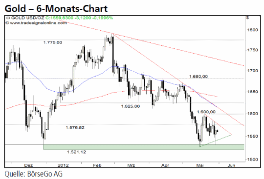 Rückblick: Der Goldpreis bildete im Mai nach dem Bruch der zuvor mehrfach erfolgreich verteidigten Unterstützung bei 1.625,00 USD ein kurzfristiges Verkaufssignal aus.