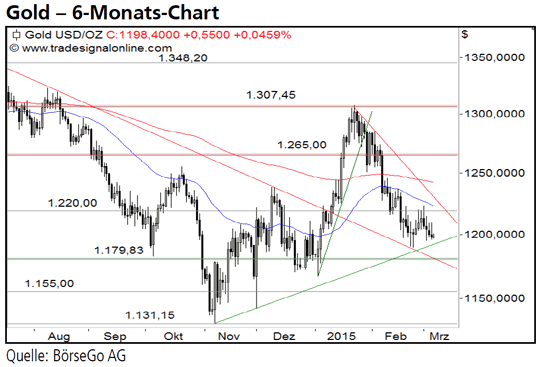 Rückblick: Nach einem wochenlangen Ausverkauf erholte sich der Goldpreis ab November 2014 und stieg bis an den Wider - stand bei 1.307,45 USD.