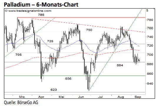 Die Bullen haben viel von ihrer früheren Stärke wieder einbüssen müssen. Kann die 684,00 USD-Marke nicht verteidigt werden, sind weitere Verluste wahrscheinlich. Die Short-Szenarien: Bricht Palladium jetzt auch unter 684,00 USD ein, wäre der Aufwärtstrend seit Ende Juni aus unserer Sicht endgültig beendet. Zunächst dürfte das Edelmetall nach diesem kurzfristigen Verkaufssignal bis 656,00 USD zurückfallen. Zwar könnte diese Unterstützung eine leichte Erholung des Kurses auslösen, doch auf mittlere Sicht sind anschliessend weitere Abgaben bis 623,00 USD zu erwarten. Die Long-Szenarien: Gelingt es den Bullen trotz des hohen Abgabedrucks die 684,00 USD-Marke zu verteidigen, müsste in der Folge auch die Hürde bei 705,00 USD überwunden werden, um eine erste spürbare Gegenbewegung einzuleiten. Sollte ein Ausbruch über die Barriere gelingen, könnte Palladium kurzfristig bis 725,00 USD ansteigen. Doch bereits an dieser Stelle könnte es zu einem weiteren massiven Ausverkauf kommen. Erst ein Anstieg über 725,00 USD wäre derzeit bullish zu werten.