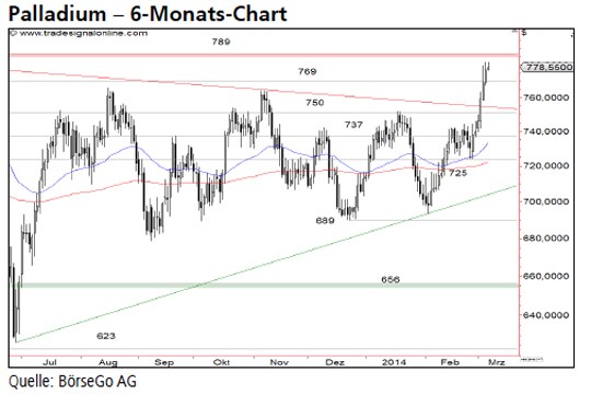 Rückblick: Mit einem gewaltigen Aufwärtsimpuls brach Palladium in den vergangenen Tagen über die Barriere bei 750,00 USD und die Oberseite einer mittelfristigen Dreiecksformation ...