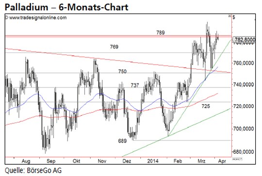 Rückblick: Nach einer Bodenbildung im Bereich von 689,00 USD stieg der Palladiumpreis seit Anfang Februar dynamisch an und durchbrach den Widerstand bei 750,00 USD.