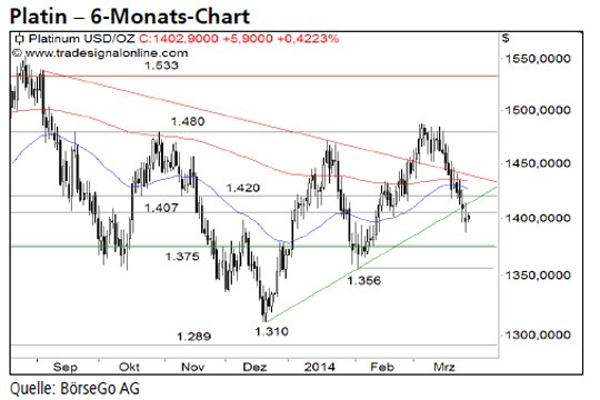 Jetzt informierenAusblick: Bleibt es auch zum Wochenschluss bei Kursen unter der Aufwärtstrendlinie, wäre ein Verkaufssignal aktiv, das den Platinpreis auch in den kommenden Tagen belasten dürfte. Die Short-Szenarien: Solange das Edelmetall unterhalb der Trendlinie und dem Widerstand bei 1.420,00 USD verbleibt, dürfte sich die Abwärtsbewegung fortsetzen. Mögliche Konsolidierungsziele lassen sich aus dem Chart bei 1.375,00 und 1.356,00 USD ableiten. Die Marke von 1.356,00 USD bildet zugleich die letzte Möglichkeit für die Bullen, ein Abdriften des Kurses in Richtung des Dezembertiefs bei 1.310,00 USD zu vermeiden. Die Long-Szenarien: Gelingt dem Platinpreis hingegen wieder die Wende zur Oberseite, wäre oberhalb einer Abwärtstrendvariante bei rund 1.440,00 USD ein Kaufsignal in Richtung 1.480,00 USD aktiv. Doch erst wenn auch diese Marke überschritten wird, dürfen die Marktteilnehmer auf einen Boden und langfristigen Anstieg bis auf 1.735,00 USD hoffen.