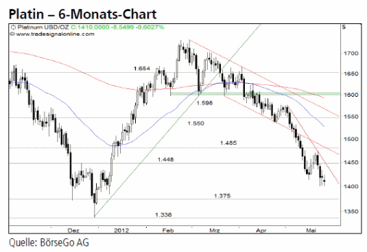 Jetzt informierenAusblick: Mit dem Bruch der 1.550 USD-Marke Anfang Mai wurde die Chance auf eine Fortsetzung der Erholung bei Platin vergeben. Ein Rückfall auf 1.338 USD wird immer wahrscheinlicher. Die Short-Szenarien: Unterhalb von 1.448 USD ist der Abwärtstrend bei Platin nach unserer Auffassung uneingeschränkt intakt und dürfte das Edelmetall zunächst bis 1.375 USD zurücksetzen lassen. Unterhalb dieser Haltemarke würde das Vorjahrestief bei 1.338 USD direkt angesteuert. Erst auf diesem Niveau könnte sich eine ausgedehnte Erholung anschliessen, die Platin durchaus bis 1.448 USD ansteigen lassen könnte. Wird jedoch auch die 1.338 USD-Marke durchbrochen, wäre ein mittelfristiges Verkaufssignal aktiv. In der Folge dürfte das Edelmetall bis 1.296 USD und darunter auf 1.230 USD einbrechen. Die Long-Szenarien: Kann sich Platin hingegen auf dem aktuellen Niveau stabilisieren und im Anschluss über 1.448 USD ansteigen, kann es zu einer kurzfristigen Erholung kommen. Diese könnte jedoch bereits bei 1.485 USD enden und der Kurs des Edelmetalls erneut von Verkaufswellen belastet werden. Erst ein nachhaltiger Ausbruch über 1.485 USD könnte nach unserer Auffassung zu einer signifikanten Entspannung der Lage beitragen. In der Folge dürfte der Kurs auf mittlere Sicht bis 1.520 und 1.550 Punkte ansteigen.
