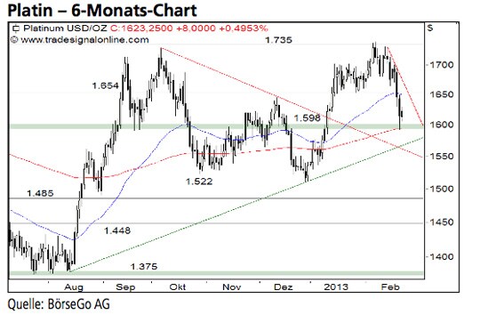 Die charttechnische Situation bei Platin ist als kritisch zu bewerten. Eine Verteidigung der 1.598,00 USD-Marke wird aktuell aus unserer Sicht zur Grundvoraussetzung für eine Fortsetzung des Aufwärtstrends. Die Long-Szenarien: Können die Bullen Platin jetzt stabilisieren und über den kleineren Widerstand bei 1.630,00 USD antreiben, dürfte eine Erholung bis 1.654,00 USD einsetzen. Ein Ausbruch über diese Hürde würde dafür sprechen, dass der Wert in seinen Aufwärtstrend zurückgefunden hat. In der Folge dürfte eine Kaufwelle bis 1.700,00 und 1.735,00 USD einsetzen. Die Short-Szenarien: Sollte die 1.598,00 USD-Marke nachhaltig unterschritten wer- den, dürfte eine weitere Verkaufswelle Platin bis 1.555,00 USD zurückführen. Sollte dort eine erfolgreiche Bodenbildung misslingen, könnte sich der Ausverkauf der letzten Tage bis 1.522,00 USD ausdehnen. An dieser Stelle dürfte sich das Edelmetall jedoch stabilisieren und seinen übergeordneten Aufwärtstrend fortsetzen. Würde diese Marke dagegen durchbrochen, wäre der gesamte Aufwärtstrend seit August 2012 in Gefahr und Verluste bis 1.485,00 USD die Folge.