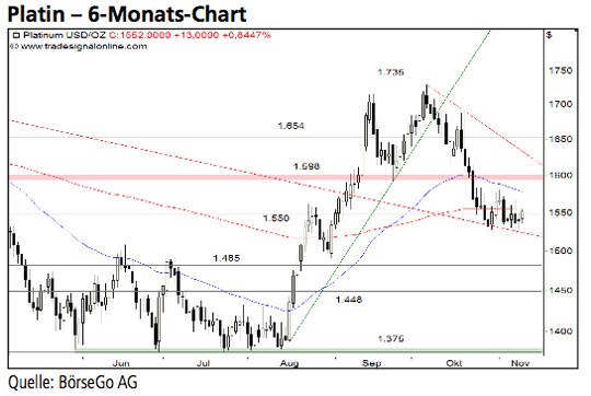Der Platinkurs steht vor einer mittelfristigen Weichenstellung und die bearishen Signale mehren sich. Eine Fortsetzung der Abwärtsbewegung ist daher aus unserer Sicht zu präferieren. Die Short-Szenarien: Fällt das Edelmetall unter die Marke von 1.550,00 USD und durchbricht es anschliessend auch das Vorwochentief bei 1.522,70 USD, kann es zu einem raschen Ausverkauf bis zur Unterstützung bei 1.485,00 USD kommen. Auf diesem Niveau kann eine kurzfristige Erholung einsetzen. Sollte dagegen auch die 1.485,00 USD-Marke unterschritten werden, dürfte eine Abwärtsbewegung bis 1.448,00 USD und darunter bis an den Ausgangspunkt der Hausse bei 1.375,00 USD führen. An dieser Stelle könnte der Abwärtstrend des Edelmetalls auf mittlere Sicht abebben und eine Bodenbildung vollzogen werden. Die Long-Szenarien: In der derzeit bearish zu wertenden Situation könnte ein Anstieg über 1.570,00 USD nach unserer Auffassung nur für eine kurze Entspannung und einen Anstieg bis 1.598,00 USD sorgen. Bereits dort dürfte sich der Abwärtstrend fortsetzen. Kann dagegen die 1.598,00 USD-Marke nachhaltig überschritten werden, wäre mit einer ausgeprägten Aufwärtsbewegung bis 1.654,00 USD zu rechnen. Sollte es den Bullen gelingen, diesen massiven Widerstand zu durchbrechen, würde ein Kaufsignal generiert, welches man entsprechend mit einem Longengagement handeln könnte. Ein Anstieg bis 1.735,00 USD wäre in der Folge möglich.