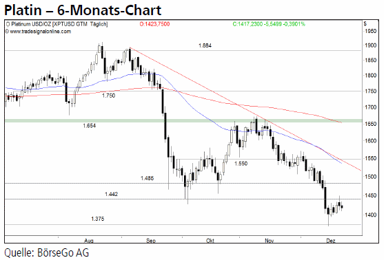 Jetzt informierenAusblick: Die Verkäufer dominieren weiterhin den Preisverlauf von Platin. Eine neue Abschwungphase könnte daher unmitelbar bevorstehen und Platin zu neuen Jahrestiefs führen. Die Short-Szenarien: Die Aussichten auf weitere Gewinne in Form von Shortengagements erscheinen aus unserer Sicht mit einem Fall unter die Unterstützungsmarke von 1.375 USD aussichtsreich. Weitere Rücksetzer bis 1.335 USD wären zu erwarten, bevor darunter das Zwischenhoch aus 2009 bei 1.296 USD als Korrekturzielmarke auf die Agenda der Verkäufer rückt. Auf diesem Niveau wären Gewinnmitnahmen gerechtfertigt, um in die nächste Erholungsbewegung erneut zu verkaufen. Die Long-Szenarien: Sollte Platin hingegen einen Anstieg über 1.442 USD vollziehen, bestünde die Möglichkeit eines zeitlich begrenzten Aufwärtsimpulses bis in den Widerstandsbereich bei 1.485 bis 1.500 USD. Spätestens dort erscheint die Wiederaufnahme der übergeordneten Korrektur wahrscheinlich. Ein Ausbruch darüber könnte andernfalls Preissteigerungen bis zum Widerstand bei 1.654 USD auslösen.