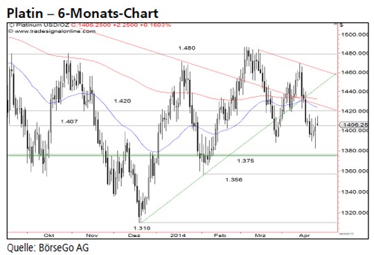 Jetzt informierenAusblick: Aktuell steht Platin Auge in Auge mit einer wichtigen Unterstützungszone, deren Bruch erhebliches Abwärtspotenzial bilden würde. Kaufdruck seitens der Bullen ist derzeit auch kaum zu verspüren. Die Short-Szenarien: Sollte der Platinkurs jetzt unter die 1.388,00 USD-Marke fallen, wäre ein kurzfristiges Verkaufssignal aktiv und ein Einbruch bis zur Haltemarke bei 1.356,00 USD zu erwarten. An dieser Stelle könnte der Wert eine Erholung vollziehen. Wird die Unterstützung dagegen ebenfalls gebrochen, sollte man sich auf einen mehrtägigen Ausverkauf bis an den Ausgangspunkt der übergeordneten Aufwärtsbewegung bei 1.310,00 USD einstellen. Selbst ein Rückfall auf 1.289,00 USD wäre in diesem Fall möglich. Die Long-Szenarien: Derzeit würde erst ein Ausbruch über die Kurshürde bei 1.420,00 USD für eine Entspannung der tendenziell bearishen Situation sprechen. Gelingt den Bullen ein solcher Befreiungsschlag, dürfte Platin kurzzeitig bis 1.460,00 USD ansteigen. Die dort verlaufende Abwärtstrendlinie könnte die Gegenbewegung jedoch wieder abbremsen.