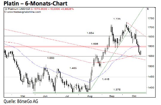 Um den Kaufimpuls seit August mittelfristig fortsetzen zu können, sollten die Bullen aus unserer Sicht die 1.550,00 USD-Marke unbedingt verteidigen. Ansonsten würde bei Platin umgehend weiteres Abwärtspotential generiert. Die Long-Szenarien: Sollte es den Käufern entsprechend gelingen, den Wert jetzt zu stabilisieren und einen Anstieg über 1.598,00 USD einzuleiten, kann eine erste Erholung bis 1.635,00 und 1.654,00 USD führen. Doch erst ein deutlicher Anstieg über diese Marke würde einen nachhaltigen Aufwärtsimpuls bis 1.690,00 USD auslösen. Die Short-Szenarien: Setzt das Edelmetall hingegen unter 1.550,00 USD zurück, wäre der Aufwärtstrend nach unserer Auffassung vorläufig been- det. In diesem Fall sollte der Platinpreis kurzfristig bis 1.485,00 USD zurückfallen. Unterhalb dieser Marke dürfte es zu einem Ausverkauf bis 1.448,00 USD und letztlich bis 1.375,00 USD kommen, ehe auf diesem niedrigen Niveau mit einer Bodenbildungsphase zu rechnen wäre.