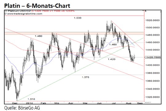 Jetzt informierenAnschliessend erreichte der Wert ein neues Verlaufshoch bei 1.518,00 USD, das nach einer Zwischenkorrektur erneut angelaufen, allerdings nicht überschritten wurde. Damit bildete sich ein bearishes Doppelhoch und Platin setzte in der Folge deutlich zurück. Mitte August wurden zudem die Unterstützung bei 1.460,00 USD und die mittelfristige Aufwärtstrendlinie durchbrochen. Es folgte ein steiler Ausverkauf unter die Haltemarke bei 1.420,00 USD. Aktuell versuchen die Bullen direkt an dieser Hürde eine Bodenbildung zu vollziehen.
