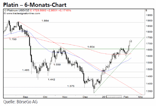 Ausblick: Mit dem Ausbruch über die Barriere bei 1.654 USD haben sich die Bullen bei Platin weiteres Aufwärtspotential eröffnet. Dennoch sollte nach unserer Einschätzung im Bereich von 1.750 USD mit einer leichten Korrektur gerechnet werden. Die Long-Szenarien: Oberhalb von 1,654 USD befindet sich das Edelmetall in einem uneingeschränkten Aufwärtstrend und dürfte die 1.750 USD-Marke in Kürze erreichen. Kann diese Hürde nach einer Zwischenkorrektur ebenfalls durchbrochen werden, könnte sich die aktuelle Hausse bis 1.800 USD fortsetzen. Mittelfristig wäre sogar ein Anstieg an die Hochpunkte aus 2011 bei 1.884 USD und 1.913 USD denkbar. Die Short-Szenarien: Kurzfristige Korrekturbewegungen bis 1.680 und darunter 1.654 USD wären aus unserer Sicht in Folge des massiven Anstieg aktuell nicht ungewöhnlich. Spätestens bei 1.654 USD sollten sich die Käufer jedoch wieder in das Geschehen einschalten. Denn sollte diese Marke durchbrochen werden, wäre dies ein deutliches Signal für eine übergeordnete Korrektur. In diesem Fall könnte es zu einer Abwärtsbewegung bis an die wichtige Unterstützung bei 1.600 USD kommen. Von dieser Marke könnte sich ein weiterer Aufwärtsimpuls anschliessen und an das aktuelle Verlaufshoch zurückführen. Ein Rückfall unter die 1.600 USD-Marke wäre dagegen bearish zu werten und könnte entsprechend mit einem Shortengagement gehandelt werden. Im Anschluss dürfte der Platinpreis bis 1.485 USD und darunter auf 1.442 USD einbrechen.
