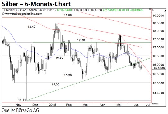 Jetzt informierenAusblick: Silber unterschritt in dieser Woche eine flache mittelfristige Aufwärtstrendlinie und bildete damit ein weiteres Verkaufssignal aus. Weitere Verluste drohen. Die Short-Szenarien: Solange es den Bullen nicht gelingt, die seit Mitte Mai aktive Abwärtstrendlinie zu durchbrechen, hätten die Bären weiter die besseren Karten und dürften den Wert an die 15,50 USDMarke drücken. Hier könnte eine leichte Erholung einsetzen, die jedoch nicht allzu lange Bestand haben dürfte. Vielmehr ist damit zu rechnen, dass Silber auch unter diese Marke und an die Unterstützung bei 15,03 USD ausverkauft wird. Dort hätten die Bullen ein weiteres Mal die Chance, eine Trendwende einzuleiten. Sollte es nicht zu einer Stabilisierung auf diesem Niveau kommen, würde ein Bruch dieser Haltemarke zu einem starken Ausverkauf bis 14,11 USD führen. Die Long-Szenarien: Kann sich Silber dagegen auf dem aktuellen Niveau stabilisieren, wartet bereits bei 16,00 USD die Abwärtstrendlinie, die eine solche Erholung abrupt beenden kann. Ein Anstieg über 16,00 USD würde zwar zu einer Erholung bis 16,50 USD führen, dort sollten die Bären jedoch erneut zuschlagen. Erst bei einem nachhaltigen Ausbruch über diesen Widerstand wäre ein Kaufimpuls bis 17,30 USD möglich.