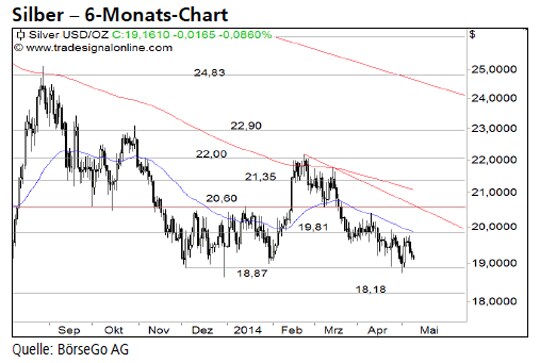Jetzt informierenAusblick: Beim Silberpreis steht es Spitz auf Knopf. Ein Bruch des bisherigen Jahrestiefs könnte in einen massiven Ausverkauf münden. Die Short-Szenarien: Der Fokus in den kommenden Tagen liegt auf den Unterstützungen bei 18,87 und 18,18 USD. Letztere Marke stellt das Jahrestief 2013 dar. Ein Rückfall unter dieses Kursniveau dürfte Kursverluste bis in den Bereich von 17,30 USD zur Folge haben. Dort befinden sich im Wochenchart zahlreiche Zwischentiefs aus dem Jahr 2010, die Unterstützung bieten. Rund 1,00 USD unterhalb dieser Horizontalen verläuft aktuell der langfristige Aufwärtstrend bei Silber. Die Long-Szenarien: Kann der Silberpreis die angesprochenen Unterstützungen hingegen verteidigen, wäre eine Kurserholung bis an den Widerstand bei 19,80 USD denkbar. Doch sollte man danach einen Abpraller in diesem Kursbereich zur Unterseite einplanen. Erst Kurse über 20,60 USD würden den Abwärtstrend beenden und das Chartbild deutlich verbessern.