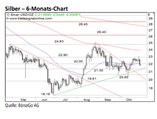 Jetzt informierenAusblick: Die Bullen haben die grosse Chance auf einen chart- technischen Durchbruch auf der Oberseite vergeben. Daher dürften die Unterstützungen in den kommenden Tagen einem Belastungstest unterzogen werden. Die Short-Szenarien: Aus dem kurzfristigen Aufwärtstrend und der mehrfach getestetenMarke von 21,35 USD ergibt sich eine Kreuzunterstützung, die bereits nicht mehr weit entfernt notiert. Kann der Silberpreis auch hier keine Wende gen Norden einleiten, könnte schnell ein Test der Tiefs aus dem September und Oktober bei 20,59 und 20,48 USD erfolgen. Ein Unterschreiten dieser Marken dürfte einen weiteren Abwärtsimpuls in Richtung der Unterstützung bei 19,81 USD einleiten. Die Long-Szenarien: Können die Bul- len den Silberpreis auf der Unterstützung bei 21,35 USD indes stabilisieren, wäre ein Anstieg in Richtung der Widerstände bei 22,00 und 22,90 USD möglich. Aber erst Kurse signifikant über 22,90 USD würden den charttechnischen Befreiungsschlag be- deuten und den Weg auf 24,83 USD frei machen.