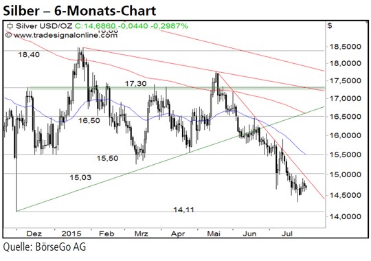 Jetzt informierenAusblick: Dass der Abwärtstrend bei Silber bislang intakt ist, ist klar. Die Frage lautet nun aber, ob in den kommenden Wochen, ähnlich wie in den Jahren 2013 und 2014, eine weitere starke Verkaufswelle einsetzen wird. Aktuell gibt es kaum Argumente, die dagegen sprechen würden. Die Short-Szenarien: Da das aktuelle Chartmuster denen der Jahre 2014 und davor 2012/13 stark ähnelt, ist das Szenario weiter fallender Kurse wahrscheinlich. Im Fokus steht dabei die letzte Hilfsunterstützung der Käufer bei 14,63 USD. Hier könnte sich der Silberpreis noch einige Tage, vielleicht auch Wochen, aufhalten. Solange sich in den kleinen Zeitebenen aber keine Bodenmuster ausbilden, bleibt das Edelmetall absturzgefährdet. Das bisherige Jahrestief bei 14,11 USD dürfte eine startende Verkaufswelle kaum aufhalten können. Unter 14,11 USD befindet sich die nächste nennenswerte Unterstützung im Chart erst wieder bei 12,43 USD. Im Bereich dieser Marke muss man abwarten, wie die nächsten Kursmuster ausfallen werden. Die Long-Szenarien: Man darf aber auch die Variante, dass bereits auf dem aktuellen Kursniveau eine Gegenbewegung eingeleitet wird, nicht völlig vernachlässigen. Ein kurzfristiger Kreuzwiderstand notiert bei 15,03 USD. Darüber bestünde Aufwärtspotenzial auf 15,50 USD. Erst wenn auch diese Marke überschritten wird, könnte eine grössere Erholung auf 16,50 USD einsetzen. Der übergeordnete langfristige Abwärtstrend verläuft derzeit bei rund 18,50 USD und sollte im Auge behalten werden.