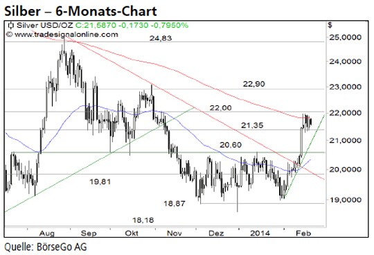 Jetzt informierenAusblick: Aktuell notiert der Silberpreis knapp unterhalb dieser Barriere in aussichtsreicher Position. Ein Ausbruch über die Marke würde für eine mittelfristige Trendwende sprechen. Die Long-Szenarien: Oberhalb des ehemaligen Widerstands bei 21,35 USD ist die Kaufwelle der letzten Tage uneingeschränkt intakt und dürfte auch zu einem Ausbruch über 22,00 USD führen. Im Anschluss wäre mit einer Ausweitung der jüngsten Rallybewegung bis 22,90 und 23,41 USD zu rechnen. An dieser Stelle könnte es zwar zu einer leichten Gegenbewegung kommen, doch dürfte das Edelmetall in diesem Fall mittelfristig auch über diese Marke ansteigen und die Kaufwelle bis in den Bereich der Barriere bei 24,83 USD fortsetzen. Die Short- Szenarien: Sollte der Wert in den nächsten Tagen nicht direkt über 22,00 USD ausbrechen können, dürfte es zu einem kurzfristigen Unterschreiten der 21,35 USD-Marke kommen. In der Folge sollte der Silberpreis einen bullish zu wertenden Rücklauf an die Ausbruchsmarke bei 20,60 USD vollziehen. Auf diesem Niveau dürfte sich der Wert wiederum stabilisieren und zu einem erneuten Anstieg ansetzen. Ein Ausverkauf unter diese wichtige Unterstützung würde die Rally der letzten Tage dagegen wieder in Frage stellen. Kurzfristig dürfte es in diesem Fall zu Abgaben bis an die Haltemarke bei 19,81 USD kommen.