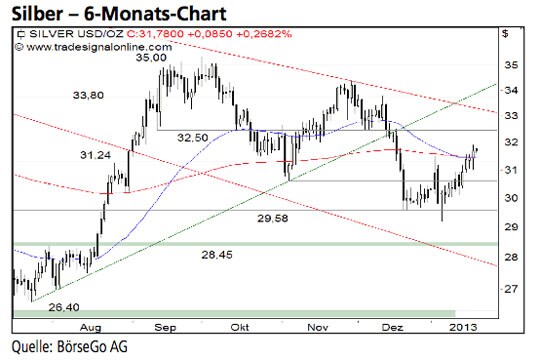 Ein nachhaltiger Ausbruch über 31,90 USD würde ein kurzfristiges Kaufsignal und eine entsprechende Erholung beim Silberpreis auslösen. Von einem vorzeitigen Ende des Abwärtstrends kann aus unserer Sicht jedoch auch in diesem Fall noch nicht gesprochen werden. Die Short-Szenarien: Sollte die Erholung des Silberpreises auf dem aktuellen Niveau enden, dürfte es zunächst zu einem Rückfall auf 30,50 USD kommen. Darunter würde die zentrale Unterstützung bei 29,58 USD angelaufen. Dort wäre mit einer mittelfristigen Bodenbildung zu rechnen. Sollte die Marke im weiteren Verlauf jedoch ebenfalls durchbrochen werden, wäre ein Verkaufssignal mit einem ersten Ziel bei 28,45 USD aktiv. Die Long-Szenarien: Ein nachhaltiger Ausbruch über 31,90 USD würde dagegen zu einem steilen Anstieg bis 32,50 USD und darüber bis 33,00 USD führen. An dieser Stelle könnte eine leichte Gegenbewegung einsetzen. Sollte die 33,00 USD-Marke im weiteren Verlauf ebenfalls durchbrochen werden, sind Folgekäufe bis 33,80 und 34,50 USD wahrscheinlich. Damit würde zugleich der Abwärtstrend seit Oktober 2012 beendet werden.