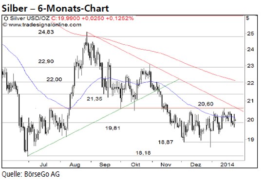 Jetzt informierenAusblick: Übergeordnet befindet sich Silber in einer Seitwärtskonsolidierung. Solange der Wert unterhalb von 20,60 USD notiert, ist die Gefahr aus unserer Sicht stark erhöht, dass diese Phase nach unten hin aufgelöst wird. Die Short-Szenarien: Setzt sich die Kursschwäche des Edelmetalls fort, wäre mit einem Kursrutsch unter die kleine Haltemarke bei 19,40 USD zu rechnen. Dies könnte den Auftakt für einen Ausverkauf bis an das Tief bei 18,18 USD bilden. An dieser Stelle wäre mit einer kurzzeitigen Erholung zu rechnen. Sollte der Wert jedoch auch unter die wichtige Unterstützung einbrechen, dürfte sich die Baisse auf mittlere Sicht bis 17,30 USD ausdehnen. Die Long- Szenarien: Erst ein nachhaltiger Ausbruch über den starken Widerstand bei 20,60 USD würde das Edelmetall wieder in eine bullishe Situation bringen. In diesem Fall wäre ein kurzfristiges Kaufsignal aktiviert, das einen Ausbruch über die kurzfristige Abwärtstrendlinie und einen Anstieg bis 21,35 USD nach sich ziehen könnte. Sollte auch diese Marke überschritten werden, kann die Erholung bis 22,00 USD führen.