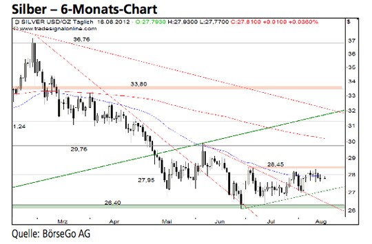 Ausblick: Seit Ende Juni schwankt der Silberpreis in einem engen Preiskorridor zwischen 26,10 und 28,45 USD. Die Ausbruchsrichtung aus dieser Seitwärtsphase dürfte aus un- serer Sicht den weiteren mittelfristigen Verlauf vorgeben. Die Long-Szenarien: Sollte es den Käufern gelingen, den massiven Widerstand bei 28,45 USD zu überwinden, wäre ein Kaufsi- gnal aktiv, das zunächst einen Anstieg bis 29,76 USD auslö- sen könnte. Wird auch diese Hürde durchbrochen, kann ein Anstieg bis 31,24 USD erfolgen. Die Short-Szenarien: Schei- tert der Wert dagegen an 28,45 USD und setzt anschliessend unter 27,00 USD zurück, dürfte die wichtige Unterstützung bei 26,40 USD erneut attackiert werden. Deren nachhaltiger Bruch würde nach unserer Auffassung ein mittelfristiges Ver- kaufssignal auslösen, welches man entsprechend „short“ han- deln könnte. In diesem Fall dürfte der Silberpreis relativ zügig bis auf 24,50 USD abfallen. Erst auf diesem Niveau könnte es zu einer Erholung kommen.