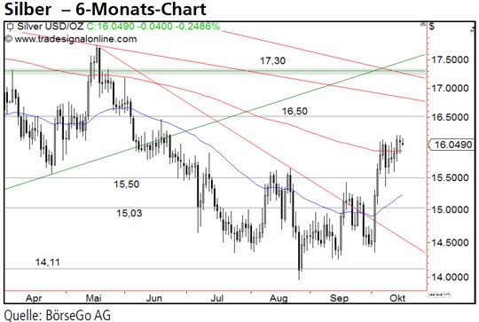 Jetzt informierenAusblick: Aufgrund der steilen Ausbruchsbewegung ist bei Silber ein Kaufsignal aktiv. Dies könnte das Edelmetall auch mittelfristig weiter nach Norden antreiben. Die Long-Szenarien: Zunächst dürfte der Wert bis an den Widerstand bei 16,50 USD haussieren. Dort sollte es zu einer Gegenbewegung kommen, die durchaus ein weiteres Mal bis 16,00 und 15,50 USD führen kann, ohne den Ausbruch in Frage zu stellen. Im Anschluss dürften sich jedoch wieder die Bullen in Szene setzen und könnten das Edelmetall bei einem Ausbruch über 16,50 USD direkt bis an die 17,30 USD-Marke befördern. Wird auch diese Barriere überwunden, könnte es zu einem mittelfristigen Anstieg bis in den Bereich um 18,00 USD kommen. Die Short- Szenarien: Oberhalb des früheren Widerstands bei 15,50 USD ist der jüngste Aufwärtstrend von Silber intakt. Erst bei einem nachhaltigen Ausverkauf unter diese Marke wäre die Kaufwelle unterbrochen und weitere Zugewinne nur über den Umweg einer Korrektur bis 15,03 USD möglich. Sollte diese Unterstützung im weiteren Verlauf allerdings ebenfalls gebrochen werden, käme es zu einem Ausverkauf bis 14,11 USD.