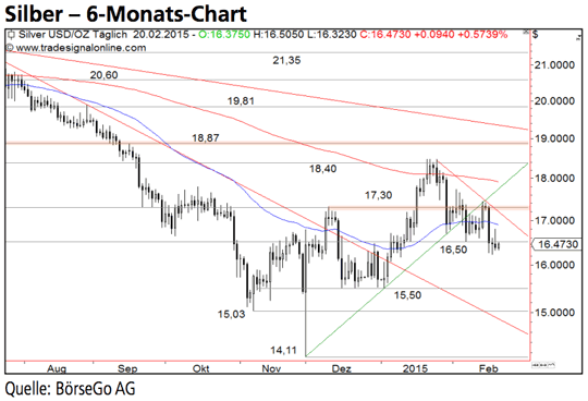 Jetzt informierenAusblick: Silber befindet sich jetzt in einer charttechnischen Pattsituation. Zwar versuchen sich die Bullen gegen drohende Verluste zu stemmen, doch dürften sich nach unserer Auffassung am Ende die Verkäufer durchsetzen. Die Short-Szenarien: Kurzfristig könnte es zu einem Anstieg bis an den Widerstand bei 17,30 USD kommen. Auf diesem Niveau sollten die Bären jedoch erneut Verkaufsdruck ausüben und könnten bei einem Bruch der 16,23 USD-Marke ein weiteres Verkaufssignal generieren. In diesem Fall stünde ein mittelfristiger Einbruch bis an die 15,50 USD-Marke auf der Agenda, ehe sich Silber wieder etwas stabilisieren könnte. Sollte allerdings auch diese Marke dem Ansturm der Verkäufer zum Opfer fallen, wäre mit weiteren Abgaben bis 15,03 USD und darunter gegebenenfalls bis 14,11 USD zu rechnen. Die Long-Szenarien: Steigt der Silberpreis dagegen in den nächsten Tagen über die Hürde bei 17,30 USD an, käme es zu einer zweiten Attacke auf die 18,40 USD- Marke. Aufgrund der derzeitigen Schwäche des Edelmetalls ist ein direkter Ausbruch über diese Marke wenig wahrscheinlich. Sollte den Bullen dieser Kraftakt dennoch gelingen, wäre ein starkes Kaufsignal mit einem Ziel bei 20,00 USD aktiv.