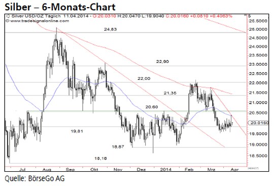 Jetzt informierenAusblick: An dieser Marke wurde die Verkaufswelle bisher erfolgreich gestoppt. Allerdings ist das Verkaufssignal weiter intakt und damit aus unserer Sicht mit erneuten Abgaben zu rechnen. Die Short-Szenarien: Sollte es den Käufern in den nächsten Tagen nicht gelingen, den Widerstand bei 20,60 USD zu durchbrechen, dürfte es zu einer weiteren Verkaufswelle unter die Unterstützung bei 19,81 USD kommen. Dies hätte ein Verkaufssignal zur Folge, welches einen Einbruch bis 18,87 USD auslösen könnte. An dieser Stelle sollte sich Silber vorübergehend erholen. Wird die Haltemarke dagegen ebenfalls durchbrochen, sind weitere Verluste bis 18,18 USD wahrscheinlich. Selbst ein kurzfristiger Einbruch bis 17,50 USD wäre in diesem Fall möglich. Die Long-Szenarien: Steigt das Edelmetall dagegen über die Oberseite der jüngsten Seitwärtsbewegung bei 20,60 USD an, hätten die Bullen ein erstes kleines Kaufsignal generiert. In der Folge könnte eine Kaufwelle bis an die Kurshürde bei 21,35 USD zu einer Fortsetzung der Erholung führen. Darüber würde das Verlaufshoch bei 22,00 USD angesteuert. Aufgrund der aktuellen Schwäche von Silber ist jedoch nicht mit einem direkten Ausbruch über diese Barriere zu rechnen. Vielmehr sollte das Edelmetall von dieser Marke zurücksetzen und eine weitere Abwärtsbewegung starten.