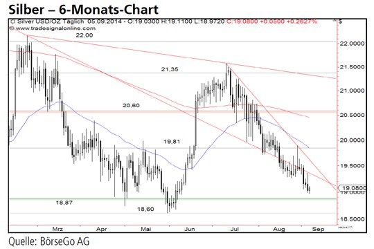 Jetzt informierenEine Erholung ausgehend von diesem Niveau scheiterte im Juli am Widerstand bei 21,35 USD. Seither fiel Silber wieder deutlich zurück und brach Mitte August auch unter die wichtige Haltemarke bei 19,81 USD ein. Damit wurde der Anstieg seit Juni endgültig neutralisiert und ein Verkaufssignal ausgebildet. Aktuell nähert sich das Edelmetall bereits bedrohlich der 18,87 USD-Marke.